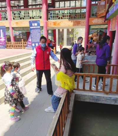 志愿者們不懼烈日,在古鎮(zhèn)開展文明勸導(dǎo)工作。當(dāng)游客走累了,靠在欄桿處休息時,志愿者立即走過去耐心勸導(dǎo)游客,說明此處危險,并向游客指明休息場所;當(dāng)有游客爬到景區(qū)禁止攀爬的設(shè)施上照相時,志愿者們耐心勸導(dǎo),引導(dǎo)游客文明照相。在閑暇之余,志愿者還要在古鎮(zhèn)內(nèi)撿煙頭、撿落地垃圾等。