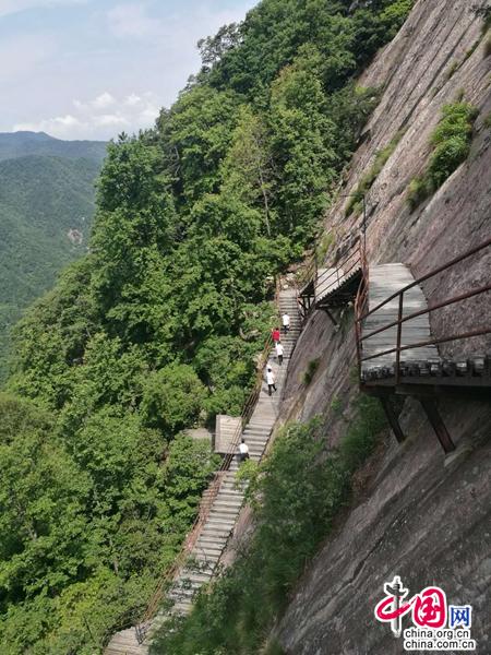 我鼓足勇氣,繼續(xù)一級一級向上攀登,一邊不斷地拍下照片。我時不時地打開手機(jī),既怕電量不夠,更怕內(nèi)存已滿。看到那些?入絕壁的龍須草、黃山松、銳齒槲櫟、映山紅……它們就像是一幅幅色彩艷麗的天然壁畫,不僅給了我美的享受,詩的靈感,更是給了我一種一往無前、奮力攀登的豪情和力量。