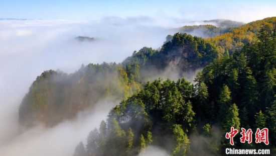 10月上旬,甘肅省定西市漳縣貴清山國家森林公園,朝陽在云層中若隱若現(xiàn),云遮霧繞的景象讓層巒疊嶂的山峰成為“云端村落”,仿若仙境。漳縣貴清山國家森林公園境內(nèi)原始森林遍布,森林、動植物資源十分豐富,貴清山被譽為隴中的“小華山”,是生態(tài)旅游勝地。