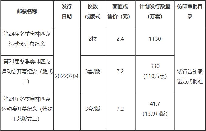 今日,國家郵政局公布《第24屆冬季奧林匹克運(yùn)動會開幕紀(jì)念》紀(jì)念郵票計(jì)劃發(fā)行數(shù)量及仿印審批目錄情況。