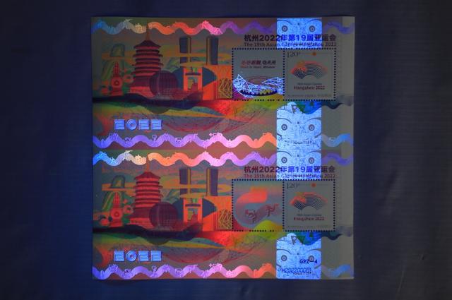 據(jù)了解,《杭州2022年第19屆亞運(yùn)會》特殊版式個(gè)性化郵票雙連張是中國集郵有限公司匠心打造的首款GPZ編號體育題材郵票,由青年設(shè)計(jì)師趙郁竹擔(dān)綱設(shè)計(jì),限量發(fā)行。它依托杭州亞運(yùn)會色彩系統(tǒng)和視覺形象元素,融歷史文化、現(xiàn)代美學(xué)和未來暢想于一體,集藝術(shù)感、科技感和運(yùn)動感于一身,展現(xiàn)中華文明、浙江風(fēng)采、杭州韻味和時(shí)代魅力,采用特殊版式、編號和工藝,紫光燈下局部呈現(xiàn)無色熒光油墨圖案和全真彩效果,傳遞中國郵政對杭州亞運(yùn)的美好祝福。(圖片由人民日報(bào)客戶端提供)