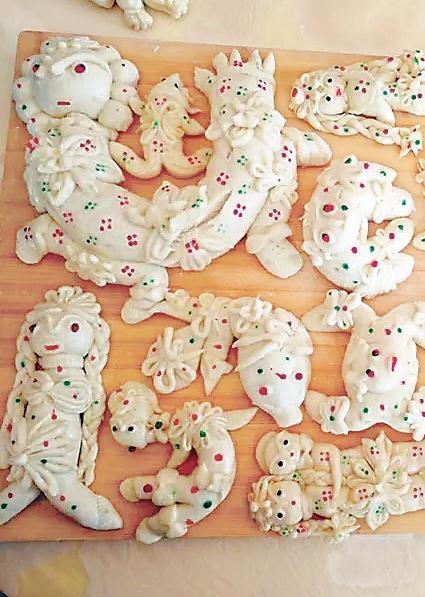 靜寧人的花饃饃,正是應(yīng)和了消病消災(zāi)、祈求平安的民間心理。端午禮儀中的面塑,表達(dá)著人們對(duì)美好事物的向往和祈禱。雖然是以食物的面目出現(xiàn),但那些充滿靈性的造型,卻飽含著人文的意蘊(yùn)。靜寧人塑成動(dòng)物的面花中,最多的是蟾蜍和蛇。蛇面花多是盤成一團(tuán)的,沒有攻擊性又溫和的樣子。蟾蜍面花本地人叫“癩呱子”,形象很可愛,多的是兩只后足弧形對(duì)稱,蜷在腹部?jī)蓚?cè);兩只前足在頭頂相合,呈環(huán)抱姿態(tài)。也有別出心裁的婦女,會(huì)做出十二生肖之類的面花,這些面花,修飾并不夸張,其神韻更勝于外在的精致技巧。所有的端午面花都寄寓著大人們的祈福,但孩子們最喜歡的是動(dòng)物面花,古靈精怪的,讓他們舍不得摸,更舍不得吃,只能與荷包一起掛在胸前賞玩,或與鄰家的小孩子一起比,看誰(shuí)的媽媽手更靈更巧。