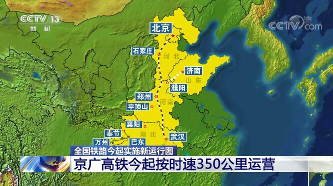 京廣高鐵從北京至武漢這一段,今天起按時(shí)速350公里運(yùn)營,新型復(fù)興號(hào)智能動(dòng)車組列車上線。從北京到武漢,旅行時(shí)間縮短到4小時(shí)以內(nèi)。