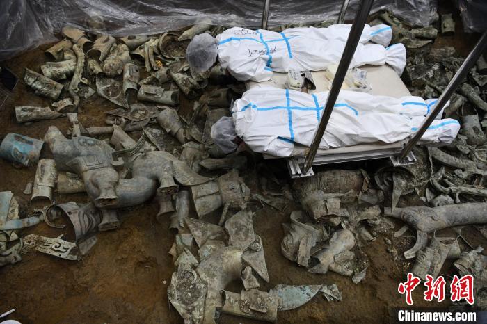 8號祭祀坑等待提取的精美文物?!埨?nbsp;攝