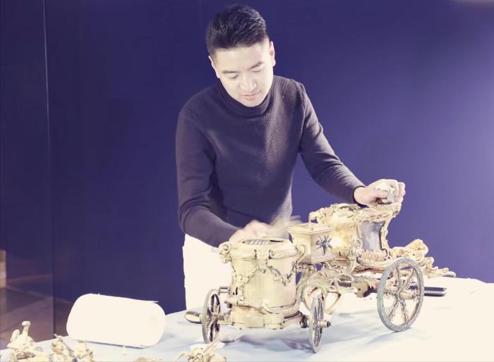 “這件‘魔術(shù)人鐘’功能比較復(fù)雜,經(jīng)過長期開動后,出現(xiàn)了一點故障,就存放在了庫房。”亓昊楠說,自己和師父王津一起修復(fù)這座鐘表時,才發(fā)現(xiàn)它的內(nèi)部系統(tǒng)有多精細。
