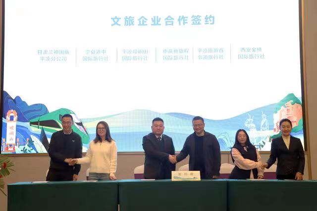 專題推介會上,平?jīng)鍪形幕瘡V電和旅游局推介了全市文旅資源及“引客入平”系列支持政策,崆峒山、大云寺·王母宮、龍泉寺、云崖寺等重點景區(qū)和涇川橙香瑤池溫泉酒店分別作了主題推介。平?jīng)鑫穆猛豆九c西安一帶一路文旅公司、涇川大云恒盛旅游公司與西安黃河國旅、崇信公劉文旅投公司與寶雞春暉旅行社、莊浪關(guān)山文旅投公司與寧夏新文化國旅、崆峒山國旅與重慶新旅程國旅、甘肅蘭神國旅平?jīng)龇止九c寧夏港中國旅、平?jīng)雎糜伟偈峦ㄅc西安金橋國旅等14家省內(nèi)外旅行社分別簽訂“引客入平”客源互送合作協(xié)議。推介環(huán)節(jié)還進行了《神仙留戀的好地方》《崆峒武術(shù)魂》《折柳》和《春天的芭蕾》等文藝表演,與會嘉賓參觀了“問道崆峒·養(yǎng)生平?jīng)?rdquo;文旅形象圖片展、文旅產(chǎn)品市集、非遺技藝展示及網(wǎng)絡(luò)直播和非遺文創(chuàng)產(chǎn)品展。甘肅省文旅廳有關(guān)處室、各相關(guān)市州文旅部門負責(zé)人和省內(nèi)外旅行商、文旅企業(yè)、媒體記者代表,平?jīng)鍪兄攸c景區(qū)、文旅投公司、文創(chuàng)企業(yè)代表共150余人參加。