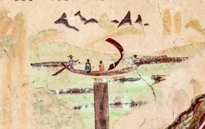 同樣是水上活動(dòng)的操舟,在敦煌壁畫(huà)中也有多種表現(xiàn)。無(wú)論是舟的形制,還是操舟者的運(yùn)行方式,都極為形象地展現(xiàn)在壁畫(huà)中。在時(shí)代為北周的莫高窟296窟中,有一艘正在水中航行,船體較短的獨(dú)木舟,尖頭尖尾,中間大、兩頭小。獨(dú)木舟中間乘坐三人,船頭船尾各有一名赤膊強(qiáng)健的水手在搖櫓與撐篙。這一畫(huà)面體現(xiàn)了人們于水中蕩舟的活動(dòng)場(chǎng)景。而在時(shí)代為初唐的莫高窟323窟中,壁畫(huà)中展現(xiàn)的操舟形象卻是另一番場(chǎng)景,畫(huà)面中的船雖然仍是一葉扁舟,但舟身上部設(shè)置了風(fēng)帆,用于劃船的櫓也很清晰,類(lèi)似今天的搖櫓帆船。舟行水中,風(fēng)帆鼓浪,前有一人撐槳,整體呈現(xiàn)出一幅“風(fēng)帆欲起橫江上,水影遙看海上天”的運(yùn)動(dòng)場(chǎng)景(圖①)。