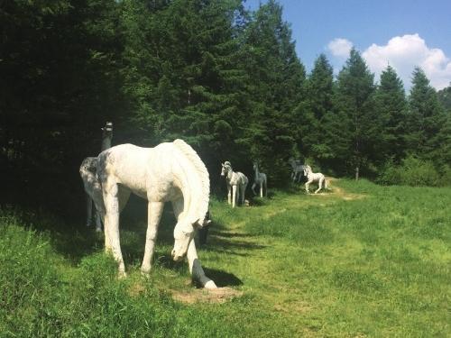 在碧草連天的谷地,當(dāng)?shù)芈糜尾块T(mén)擺放了一組白馬的大型雕塑,栩栩如生,它們要么仰天長(zhǎng)嘶,要么低首撫弄地上的青草,還有的彼此耳鬢廝磨,像是親密的戀人。