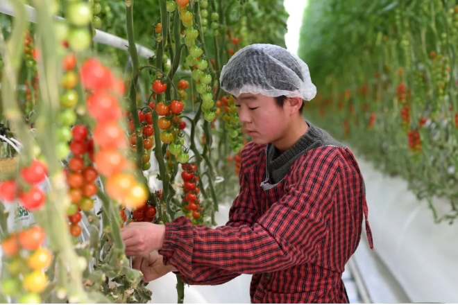 在古浪縣黃花灘生態(tài)移民區(qū)富民新村現(xiàn)代化智能玻璃溫室,村民在管護(hù)番茄 范培珅 攝