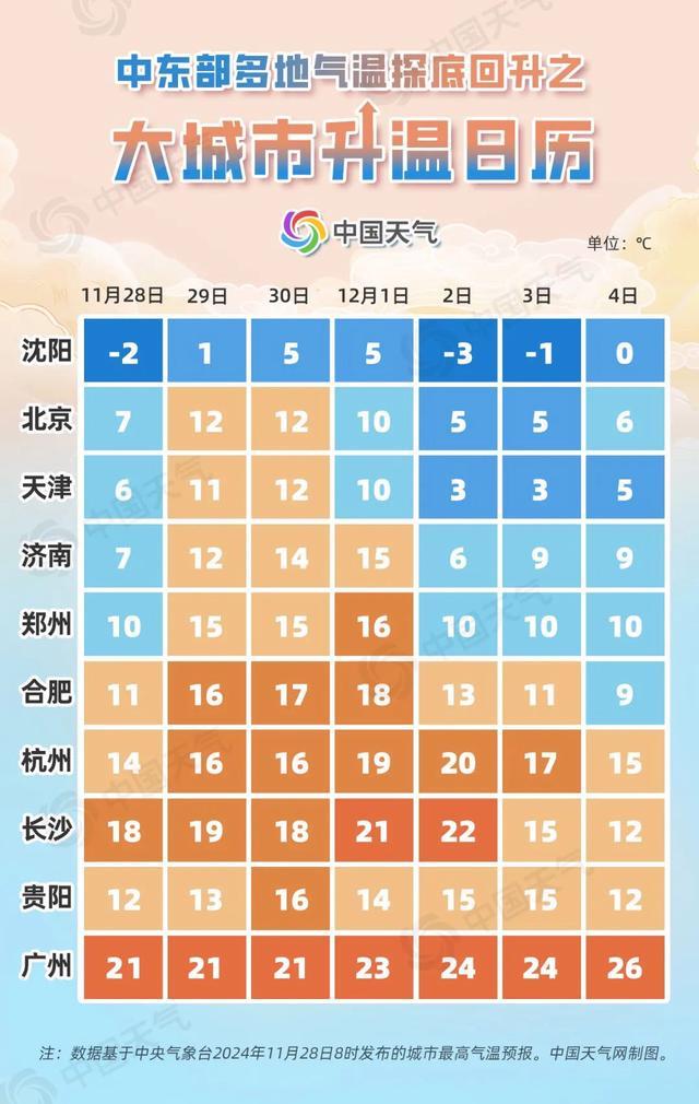 過去五天,今年下半年首場寒潮來勢洶洶,我國多地都度過了下半年來最冷的一天。隨著寒潮影響結(jié)束,中東部大部氣溫探底回升,今天(11月28日)起各地將陸續(xù)進入升溫模式,長江中下游等地有望沖擊20℃。中國天氣網(wǎng)推出大城市升溫日歷,看你家何時上演冷暖逆轉(zhuǎn)。