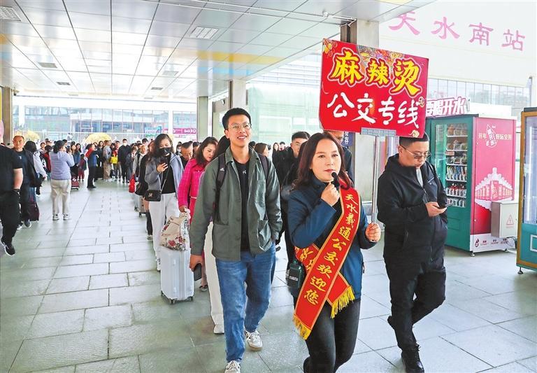 2024年4月3日,志愿者在天水南站引導(dǎo)游客乘坐免費(fèi)的“麻辣燙公交專線”。新甘肅·甘肅日?qǐng)?bào)記者 高檣