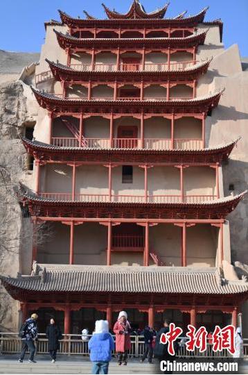 1月13日,甘肅敦煌莫高窟景區(qū)內(nèi),游人在莫高窟標(biāo)志性建筑九層樓前拍照打卡。據(jù)了解,從2024年12月1日至2025年2月28日,當(dāng)?shù)伉Q沙山月牙泉、玉門關(guān)、敦煌雅丹世界地質(zhì)公園等景區(qū)對(duì)國(guó)內(nèi)外所有游客免門票,莫高窟門票實(shí)行半價(jià)優(yōu)惠,開放洞窟由8個(gè)增加至10個(gè),為游客提供了更為豐富的觀賞內(nèi)容。中新社記者 李亞龍 攝