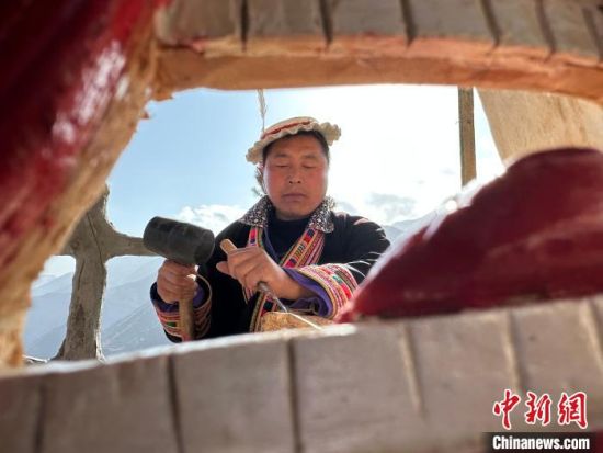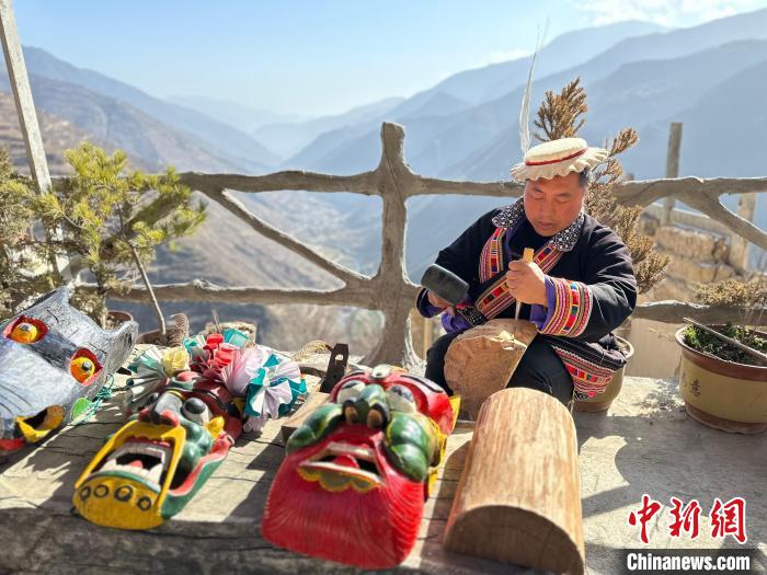 雕刻、打磨、上色……甘肅隴南市文縣鐵樓藏族鄉(xiāng)強(qiáng)曲村,白馬人薛剛一家四代人都精于木工。日前中新網(wǎng)記者走訪村子時(shí),薛剛坐在自家院子里,伏案制作池哥晝所用面具。池哥晝是白馬人保留最完整、最具特色民族舞蹈,面具是重要道具之一。薛剛制作的面具不僅用于周邊村子的池哥晝中,而且被廣州、上海等地的客商購(gòu)買(mǎi)收藏。他時(shí)常將自己的想象融入面具中,用心打磨使其更具“靈氣”。他說(shuō),白馬人中從事面具雕刻的手藝人不多,最近他物色了一個(gè)“00后”徒弟,對(duì)方興趣濃厚,希望將這門(mén)手藝保護(hù)傳承好。圖為薛剛在院子里雕刻面具。閆姣 攝