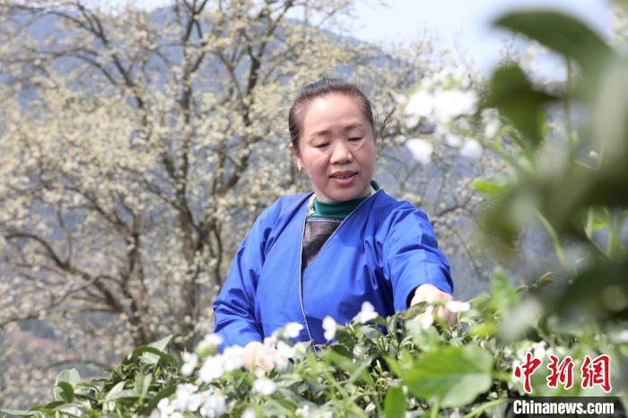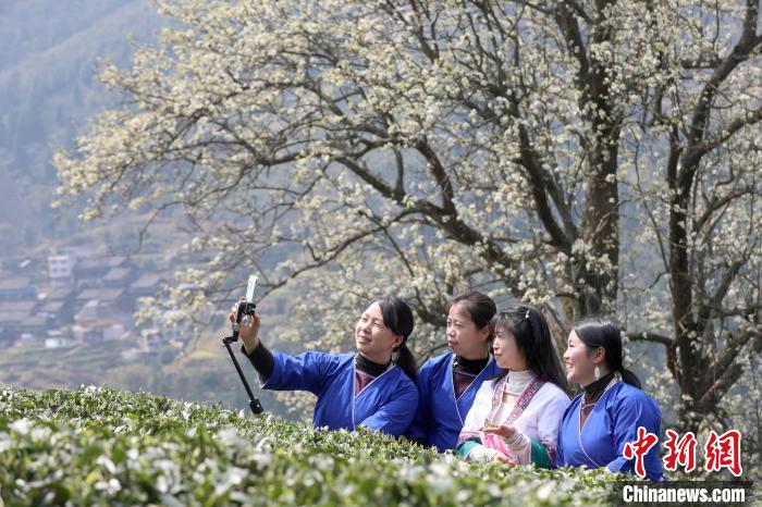 3月16日,廣西三江侗族自治縣八江鎮(zhèn)歸令村六更屯種植的千樹(shù)梨花迎春綻放,與青翠茶園、特色民居相映成趣,構(gòu)成一幅如詩(shī)如畫(huà)的春日畫(huà)卷。當(dāng)?shù)卮迕窦坝慰图娂娗皝?lái)采茶賞花、“打卡”拍照,享受春日美好時(shí)光。圖為村民在采春茶。龔普康 攝