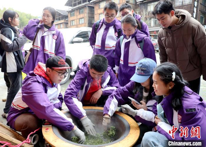 3月15日至16日,廣西柳州市一所中學(xué)組織千人研學(xué)團(tuán)到三江侗族自治縣八江鎮(zhèn)布央村仙人山景區(qū)開(kāi)展茶文化研學(xué)活動(dòng),沉浸式采春茶、炒春茶、品春茶,深入了解茶種植、茶制作、茶文化、茶品鑒等知識(shí),進(jìn)一步培養(yǎng)實(shí)踐能力、提高勞動(dòng)素養(yǎng)。圖為研學(xué)活動(dòng)現(xiàn)場(chǎng)。龔普康 攝
