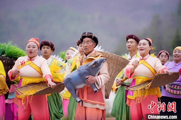 依托黎壩鎮(zhèn)層疊梯田的天然弧度與蒼翠山谷的立體聲場(chǎng),該劇將鎮(zhèn)巴民歌、陜南民俗等非遺元素融入山水實(shí)景。春之序曲《山歌迎賓》中,油菜花海間百人山歌陣,以原生態(tài)多聲部民歌編織迎賓盛景;夏之華章《綠的交響》里,非遺薅草鑼鼓與現(xiàn)代音樂碰撞出農(nóng)耕文明的力與美;秋之禮贊《金的節(jié)奏》在陽(yáng)光下呈現(xiàn)打連枷聲浪與稻浪共舞的豐收奇景;冬之情書《紅的濃情》則通過圍爐陜南說(shuō)唱,在吊爐光影間訴說(shuō)巴山兒女的熾熱情懷。