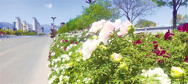 道路旁牡丹花爭相開放