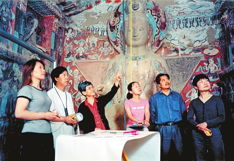 樊錦詩帶領(lǐng)項(xiàng)目團(tuán)隊(duì)在莫高窟第275窟核對(duì)石窟考古報(bào)告測(cè)繪圖。