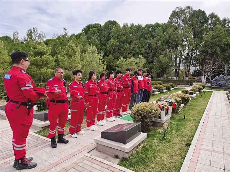 除了應急保障,救援隊還主動參與到植樹活動中。他們利用空閑時間,和志愿者一起揮鍬挖坑、扶苗培土,動作熟練且充滿干勁。隊長張建欣表示:“我們不僅是來保障安全的,更是來貢獻一份力量的。能親手為英烈種下一棵樹,是我們的榮幸。”